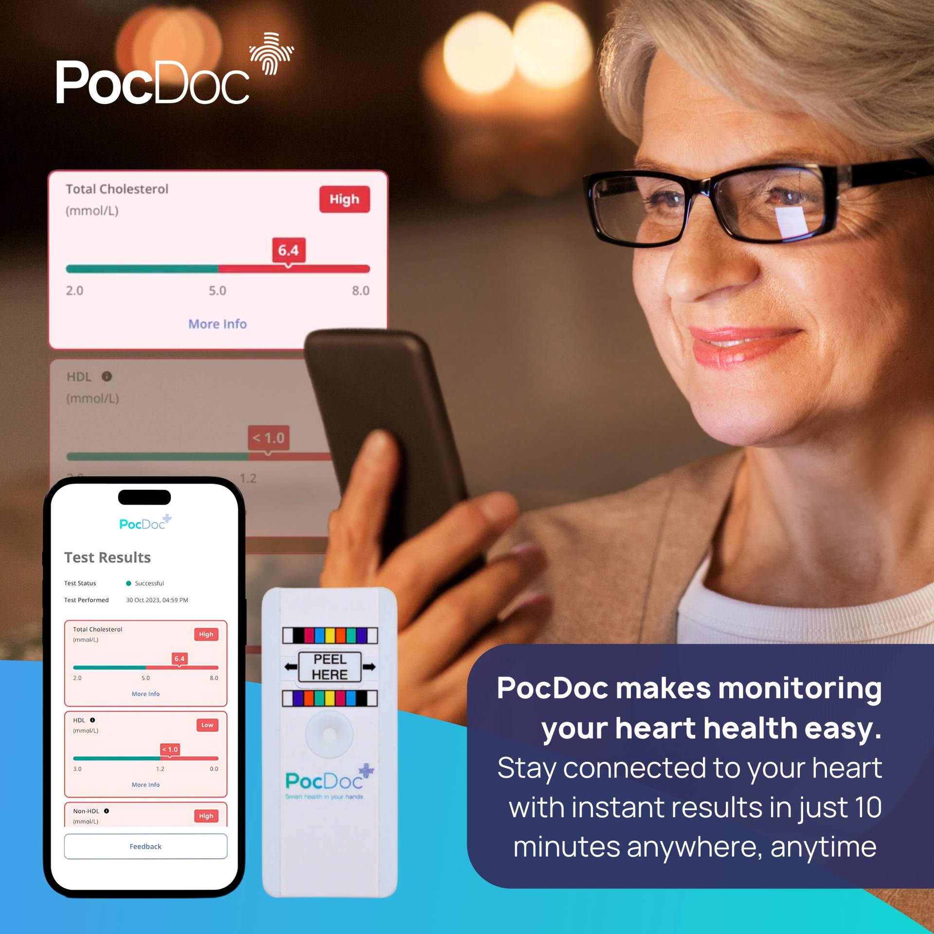 The PocDoc Healthy Heart Check enables users to discover their heart health in under 10 minutes, including a full lipid panel, Heart Age and 10 year risk of heart attack/stroke. The fully